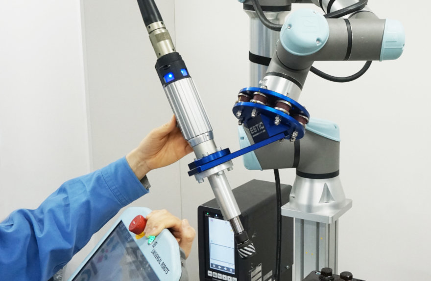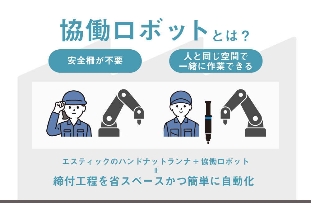 エスティックのハンドナットランナと協働ロボットを組み合わせることで、締付工程を省スペースかつ簡単に自動化できます。