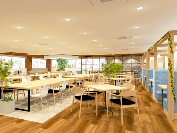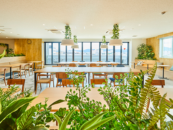 社員食堂では従業員が健康を維持し、イキイキと働けるよう管理栄養士とも連携し、味・栄養はもちろん、嗜好を満たす豊富なメニューを用意しています。またストレスを軽減できるように音楽を流し、緑視率にもこだわり快適なランチタイムを提供しています。
